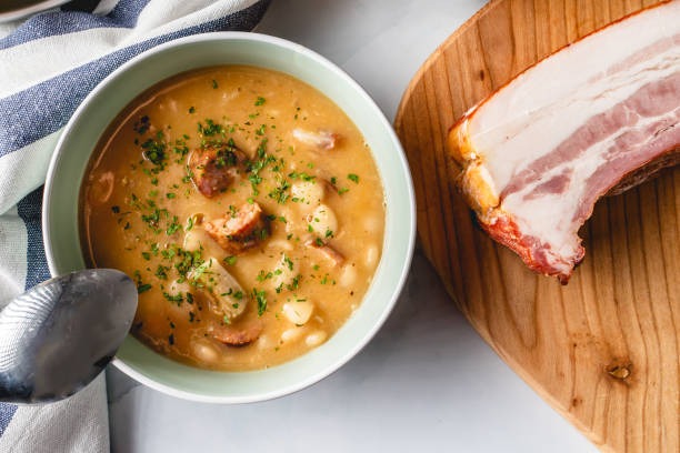 ถั่วพินโตหรือถั่วขาวเป็นชนิดที่นิยมมากที่สุดในฮังการี เพราะมีเนื้อแน่นแต่ไม่แข็งจนเกินไป หลังต้มแล้วจะให้รสหวานธรรมชาติและเนื้อนุ่มละมุน การแช่ถั่วไว้ข้ามคืนไม่เพียงช่วยให้สุกเร็วขึ้น แต่ยังช่วยลดกลิ่นถั่วที่แรงเกินไป - ใช้หมูรมควันแท้จากตลาดท้องถิ่น (ถ้ามี)